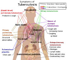 Туберкульоз (лат. tuberculosis; або ТБ — скорочення від туберкульозна бактерія; заст. сухоти[9][10]; рос. чахотка) — поширене й у багатьох випадках летальне інфекційне захворювання з хронічним перебігом і частою багатосистемністю уражень. Трапляється як серед людей, так і серед тварин. Його спричинюють різні види мікобактерій, частіше за все Mycobacterium tuberculosis.[11] Найчастіше патологічний процес зосереджується в легенях (легеневий туберкульоз), також може уражати інші органи тіла (позалегеневий туберкульоз) — мозкові оболони, нирки, печінка, кістки, шкіра тощо. Передається повітряно-крапельним механізмом передачі інфекції, коли хворі на активний легеневий або гортанний туберкульоз кашляють, чхають або іншим чином виділяють слину у повітря.[12] Велика частка випадків хвороби є субклінічними і латентними. Приблизно кожна 10-та латентна інфекція прогресує до активного процесу.