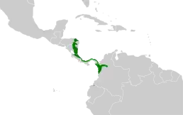 Вид поширений на півдні Гондурасу, в Нікарагуа, Коста-Риці, Панамі, на заході Колумбії та північному заході Еквадору. Мешкає у пологах вологого лісу на висоті від 300 до 1500 м над рівнем моря та в прилеглих лісистих районах.