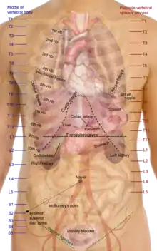 Окремі частини діляться далі на регіони (Regiones pectoris, Regiones abdominis, Regiones dorsi і Regiones pelvis).