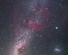 Туманність Ґама (червоне кільце) на тлі Чумацького Шляху, в нижньому правому куті видно Велику Магелланову Хмару. Найяскравіша зірка на знімку — Канопус.