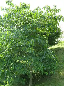 Листки чергові шкірясті голі, з довгими черешками, серцеподібні або широко-яйцюваті, 7–20 см завдовжки.