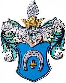 У блакитному полі герб має підкову рогами донизу. В середині підкови розміщений золотий хрест. Над гербовим щитом розмішений блакитний шолом, побокам щита срібно-золотий намет. На шоломі - золота корона з чорним орлиним крилом.