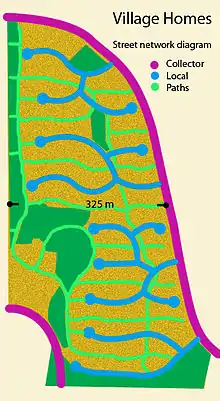 Тупики і петлі можуть зменшити розміри будь-якого району до однієї вулиці. Сусідство може бути визначене географічними межами, але частіше це загальні етнічні, соціально-економічні та культурні характеристики, які створюють соціальну згуртованість незалежно від зовнішніх фізичних «кордонів». Mehaffy et al. (2010), які пропонують модель структурування міської мережі, припускають, що мікрорайони не можуть бути спроектовані.[34] «Громада» розглядається як динамічний соціальний та культурний конструктціонізм, особливо в сучасних, відкритих, мультикультурних містах. Конфігурація вулиць для житлових районів може сприяти її виникненню лише за рахунок зменшення руху та збільшення місцевого руху пішоходів; ціль дизайну, для якої підходять тупикові та петельні вулиці.