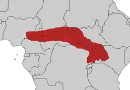 Вид поширений в Центральній Африці від Нігерії до Кенії. Мешкає у саванах та галерейний лісах.