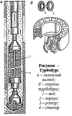 Турбобур — вибійний гідравлічний двигун, в якого гідравлічна енергія потоку промивальної рідини перетворюється у механічну роботу обертання вихідного валу, сполученого з породоруйнуючим інструментом. Робочим органом, в якому відбувається перетворення енергії, служить багатоступенева турбіна осьового лопатевого типу.