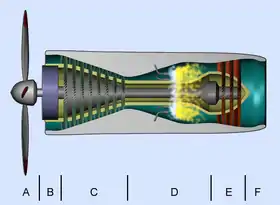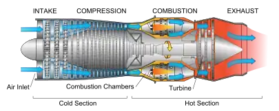 Компресор приводиться у рух турбіною, змонтованою на валу двигуна, що працює на робочому тілі, нагрітому в камері згоряння. У вхідному пристрої відбувається зростання статичного тиску повітря за рахунок гальмування повітряного потоку. У компресорі відбувається зростання повного тиску повітря внаслідок здійснюваної компресором механічної роботи. У камері згоряння відбувається нагрівання робочого тіла. Частина енергії робочого тіла забирається турбіною. У реактивному соплі формується реактивний струмінь.