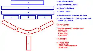 Незважаючи на те, що флот Священної ліги в складі 302 кораблів і 60 000 солдат значно перевищував османський флот, що складався із 112 кораблів і 12 000 солдат, османи завдали християнам нищівної поразки. Під час битви Тургут-реїс із двома своїми галіотами захопив папську галеру під командуванням Джамбаттісти Довіці, лицаря, який також був абатом Бібб'єни, захопивши його та екіпаж папської галери у полон.