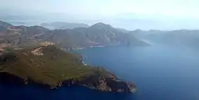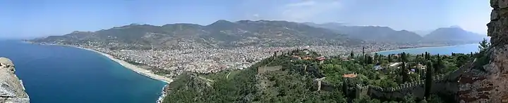 Узбережжя обрамляє гірський хребет Тавр. Тут ростуть природні соснові ліси, насаджені людиною оливкові и цитрусові гаї, а також сучасні пальмові и бананові плантації. Берегова лінія розчленована, вершини гір хребтов засніжені, місцями береги скелясті, також є відокремлені бухти і затоки. Кількість сонячних днів в році — 300 й більше.
