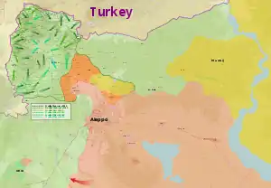 Операція «Оливкова гілка» (тур. Zeytin Dalı Harekâtı) — інтервенція турецьких військ та так званої "Протурецької Вільної Сирійської Армії" за підтримки ісламістів в сирійський район Афрін проти позицій курдської партії «Демократичний союз» в Сирії (ПДС)[33], її збройного крила Загони народної оборони (ЗНО)[34] та Демократичних сил Сирії (ДСС)[32]. Туреччина також заявляє, що воює проти Ісламської Держави (ІД)[35], хоча незалежних підтверджень цьому немає. Демократична федерація Північної Сирії претендує на Афрін та його околиці в якості регіону Афрін