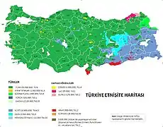 Стаття 66-а Конституції Турецької Республіки визначає поняття «турків», як тих «хто пов'язаний з турецькою державою через зв'язок громадянства», тому легальне використання слова «турецький», як громадянин Туреччини відрізняється від етнічного визначення цього слова. Втім, більшість населення Туреччини є етнічними турками або ж тюрками. Взагалі, слово «турок» чи «турецький» також має ширше значення в історичному контексті, тому що, деколи, особливо в минулому, його використовували для позначення всіх мусульманських жителів Османської імперії, незалежно від їхньої етнічної приналежності[26].