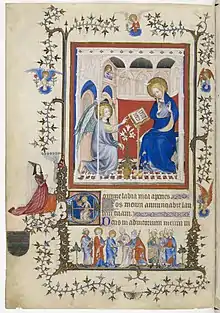 Єдиний виняток у програмі обрамлень — сторінка з мініатюрою «Virgo inter virgines». Її декор виконаний в більш багатому стилі середини XV століття (найраніше в1430-і роки) і закриває попереднє обрамлення, яке частково соскоблее (можливо, тому що воно містило портрет попереднього власника часослова)[11].
