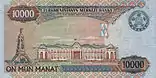Водяний знак — зображення ахалтекінського коня; на банкноті 10 000 манатів 2005 року — портрет Сапармурата Ніязова.