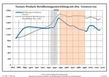 Динаміка населення з 1875 року в сучасних кордонах (Синя лінія: населення; Пунктир: відносна порівняльна динаміка населення землі Бранденбург; Сірий фон: період Третього рейху; Помаранчевий фон: період НДР)