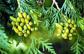 Це вічнозелене однодомне дерево, до 30 м заввишки. Крона густа, пірамідальна. Кора стовбура темно-бура або сірувато-коричнева, повздовжньо-борозенчаста, однорічних пагонів — зелена, при основі — червоно-коричнева. Листки лускоподібні (у ювенільних рослин — голкоподібні), розміщені супротивно. Чоловічі шишечки (мікростробіли) приверхівкові, в пазухах листків, майже сидячі, дрібні (до 2 мм у діаметрі), округлі, жовтаві. Жіночі шишечки (мегастробіли) овально-яйцеподібні, світло-зелені, розміщені на кінцях укорочених охвоєних гілочок. Стиглі шишки донизу відігнуті, світло-коричневі або коричнево-бурі, видовженоовальні, їхні луски шкірясто-дерев'янисті, черепичасто налягають одна на одну. Запилюється у першій половині квітня. Насіння достигає у рік запилення.