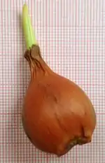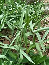 Трав'яниста рослина 10-40 (45) см заввишки[10][11][12], полікарпик. Цибулина завдовжки до 4 см[13], завширшки 1—2 см, довгаста або конусоподібна, зі шкірястими чорно-бурими оболонками, внутрішній бік яких густо вкритий притиснутими волосками. Надземний пагін одиночний, безрозетковий, тонкий, сизо-зелений, голий, у верхній частині нерідко з пурпуровим відтінком. Листків 2 (зрідка 3—4) у нижній частині стебла, вони вузькі, причому нижній трохи ширший за верхній. Обидва листки лінійні або лінійно-ланцетні, жолобчасті, направлені косо вгору або відхилені майже під прямим кутом[14], гладенькі. Їхній колір варіює від сизувато-зеленого до жовтуватого[15].