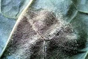 - Ураження борошнистою росою — ушкодження листя тютюну, що характеризується в тютюновому сировину наявністю білого порошкоподібного нальоту на платівці і побурінням в місцях пошкодження.