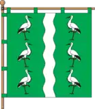 Квадратне полотнище поділене хвилясто вертикально на три смуги – зелену, білу, зелену – у співвідношенні 9:2:9. На древковій і вільній смугах по три білих лелеки, обернених до середньої смуги, які стоять один під одним, з чорним оперенням крил, червоними дзьобами і лапами.