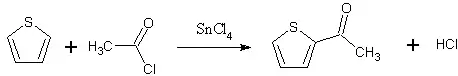 Тіофен та його похідні є менш стабільними, ніж їхні бензенові аналоги, тому багато реакцій в ряду тіофену супроводжуються поліконденсацією (смолоутворенням) та деструкцією. Тіофен досить гладко алкілюється лише в досить м'яких умовах та при використанні активніших третинних та вторинних (але аж ніяк не первинних) алкілгалогенідів. Тіофен за наявності замісників орієнтантів I роду досить легко ацилюються в присутності SnCl4 чи SnCl2 в бензені, який за даних умов не ацилюється: