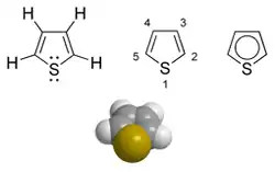 Тіофе́н — гетероциклічна органічна сполука, яка складається із чотирьох атомів карбону та одного атома сульфуру в пятичленному кільці. Тіофен є ароматичною сполукою — ароматичний секстет складають π-електрони атомів C та одна вільна електронна пара атома S. Друга вільна електронна пара атома S знаходиться на ортогональній р-орбіталі, здатна утворювати при певних умовах онієву систему.