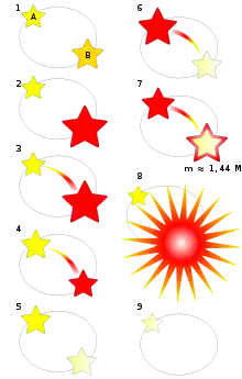 Еволюція тісних подвійних систем залежить від початкових мас компонентів і відстані між ними. На ілюстрації для прикладу наведено еволюцію системи, у якій спалахує наднова типу Ia. Можна виділити кілька етапів: