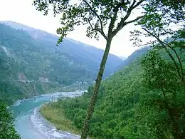 У верхній течії, в Сіккімі, річка прорізала яри та ущелини в горбистому ландшафті. На берегах ростуть листяні дерева і чагарники, характерні для субтропічного клімату, на великих висотах на схилах ущелин з'являється альпійська рослинність. Зустрічаються мілини з білого піску, який використовується в будівельній промисловості Сіккіма.