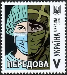 Плакат Нікіти Тітова «Передова», на якому зображені військовий і медик став ескізом поштової марки, яка 1 червня 2020 року введена в обіг[9][10].