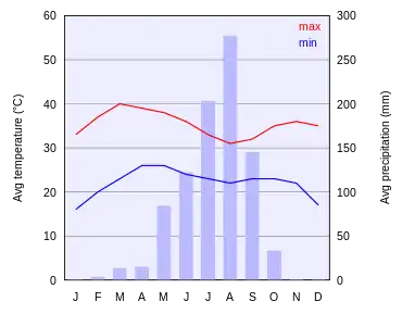 | Середній максимум, °C | 32,9 | 35,8 | 38,3 | 39,3 | 37,7 | 34,7 | 32,1 | 31,1 | 32,5 | 35,6 | 35,9 | 33,4 | 34,9 |