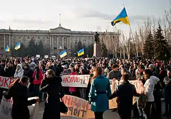 За повідомленнями ЗМІ, 15 березня на мітинг на площі Леніна зібрав від двох до десяти тисяч осіб. Цим скористалося молодіжне крило «Партії регіонів» — «Молоді регіони», які зареєстрували в міськвиконкомі свій мітинг і поставили свою сцену і звук на 30 хвилин раніше. У результаті мітингувальники розділилися на дві великі групи[7]. Міський голова Володимир Чайка під час свого виступу був обсвистаний за те, що не показався 13 березня і не озвучив свій погляд (хоча, за його словами, він був у відрядженні)[65].