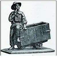 ...гірники користуються ще тачкою великих розмірів, особливо при промиванні олов'яних розсипів. У цієї тачки передню поперечну стінку роблять вище, щоб утримувати занурений матеріал. Місткість відкритого візка в півтора-два рази більше в порівнянні з тачкою, довжина її – близько 4 футів, ширина і висота – приблизно 2 і 1/2 фути. Відповідно до її прямокутної форми вона оббивається трьома прямокутними залізними смугами і з усіх боків зміцнюється залізними прутами. До днища прикріплені дві нерухомі залізні осі, на кінцях яких з обох сторін обертаються дерев'яні диски. Останні закріплені невеликими залізними шпильками (цвяхами), що перешкоджають сходженню їх з осей. Приєднаний до днища великий тупий цвях рухається в пазу, зробленому в відкаточному настилі, утримуючи вагонетку. Відкатник тримає руками тильну частину вагонетки і штовхає її перед собою. Так як під час руху вона видає звук, що нагадує деяким чином собачий гавкіт, її називають «собакою» . Таку вагонетку застосовують при відкатці з дуже довгих штолень, так як рухати її легко, а навантажувати її можна важче.
