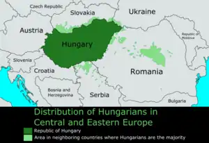 Живуть також як меншина в Румунії (1,25 млн), країнах колишньої Югославії (0,5 млн), Словаччині (0,4 млн), Україні (157 тис.) і інших країнах колишнього СРСР (4 тис.), Австрії (30 тис.) й інших країнах Західної Європи та Північної (США (0.6 млн)), Канада (0.1 млн) і Південної Америки (Аргентина (20 тис.)) й Австралії (30 тис.), разом 13,5 млн.