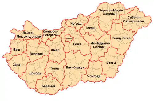 Угорщина поділена на 19 медьє (областей) та місто, прирівняне до них — Будапешт. Сучасний адміністративний поділ було введено 1950 року.