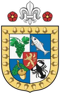 Герб на печатці являв собою іспанський щит, розсічений та перетнутий на чотири поля, з центральним щитом та обрамленням золотого кольору. В першому срібному полі зображено зелене гроно винограду на стеблі з листям. У другому синьому полі — поперек поля повернута ліворуч риба. В третьому синьому полі — золотий жолудь із зеленими стеблом та листям. В четвертому полі — поперек поля ліворуч повернутий рак. В центральному щиті червоного кольору — повернутий ліворуч лев золотого кольору, що стоїть на задніх лапах. На обрамленні герба розміщено 23 жолуді. Над щитом розташована срібна лілія, праворуч та ліворуч від неї — дві червоні троянди.