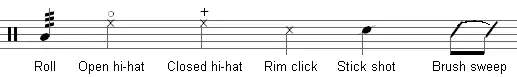 - Rim click - удар по обідку малого барабану зворотнім кінцем палички (інші назви – side stick або cross stick)