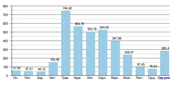 За період спостереження, абсолютний мінімальний місячний стік (абсолютний мінімум) становив 19,2 м³/с (у лютому 1979 року), абсолютний максимальний місячний стік (абсолютний максимум) становив 1110,0 м³/с (у травні 1999 року).
