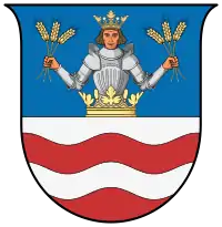 Становить собою щит французької форми, розітнутий на блакить та червень, над яким знаходиться сталевий лицарський шолом, увінчаний триріжковою дворянською короною. Над щитом знаходиться намет синього та червоного кольору, підбитий сріблом та золотом. У верхньому блакитному полі щита знаходиться постать лицаря у сталевій броні та золотій триріжковій короні, який тримає в руках по три золоті колоски пшениці. Перед постаттю лицаря — також золота дворянська триріжкова корона. У нижньому червоному полі щита — дві срібні смуги.