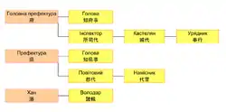 Регіональні уряди поділялися на три групи залежно від типу адміністративної одиниці. Цими одиницями були 10 головних[11] і 23 звичайні префектури[12], які напряму залежали від центру, а також 277 автономних ханів. Префектури утворювалися на землях Імператорського дому та володіннях ліквідованого сьоґунату. Стратегічно важливі префектури отримали назву головних. Вони очолювалися головою, під командою якого служили інспектори, кастеляни та урядники. Інспектори й урядники контролювали населені пункти, а кастеляни — замки. Звичайні префектури так само очолювалися головами. Від них залежали повітові урядники та особливі намісники. На противагу префектурам, що були адміністративними одиницями нового зразка, автономні хани представляли релікт попереднього періоду Едо. Вони були спадковими володіннями великих самурайських родів, які мали власні не уніфіковані системи організації управління. Хани очолювалися володарями даймьо, васалами Імператора.