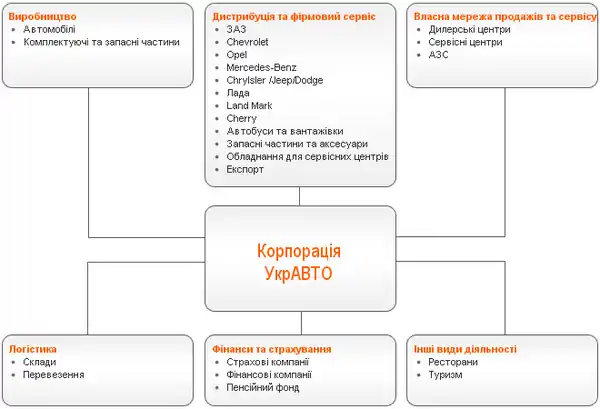 Співробітництво корпорації з такими автомобільними гігантами, як DaimlerChrysler, General Motors, Toyota, Nissan, Renault та створення спеціалізованих підприємств у складі УкрАВТО дозволяє виробляти, реалізовувати та обслуговувати модельні ряди знаних в усьому світі марок автомобілів: Mercedes-Benz, Chrysler, Jeep, Opel, Toyota, Nissan.