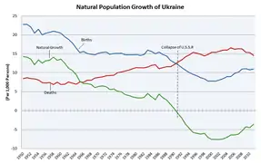 За чисельністю населення Україна посідає восьме місце в Європі. За даними останнього перепису населення, що відбувся в 2001 році, в Україні проживає понад 48,4 млн осіб. З них 77,8 % становлять українці, 17,3 % — росіяни. Частка міського населення становить 67,2 %. Офіційною мовою в Україні є українська. Унаслідок кількасотлітнього зросійщення у східних і південних областях поширена російська мова.[9] Більшість вірян є християнами, переважно православного віросповідання,[10][11] на Галичині близько половини вірян є греко-католиками.