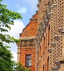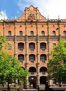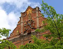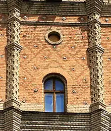 Фасад готелю прикрашає «мозаїчний килим», а також вертикальні трикутні пілястри з білої силікатної цегли. Пілястри, що піднімаються на всі п'ять поверхів, огортають мереживом будівлю й ефектно контрастують з червоною стіною. Відомо, що Каракіс тривалий час працював над розробленням міцної цегли для цієї будівлі.[3]