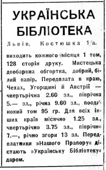 Реклама для видання «Українська Бібліотека» 1936 р.