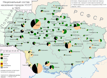 У квітні 1923 XII з'їзд РКП(б) проголосив політику коренізації. Її метою було посилення більшовицького контролю та впливу в національних районах шляхом сприяння розвитку національної за формою культури. Український варіант коренізації називався українізація[30]. Вона проводилася шляхом залучення українців до державного апарату та керівних органів громадських організацій, запровадження української мови в усьому суспільному житті, в усіх установах і навчальних закладах. Хоча частка українців серед населення України становила 80 %, у керівному апараті КП(б)У їх було менш як 30 %[30]. Органи радянської влади в Україні на 95 % складалися з російських або зросійщених працівників[30]. Через це значна частина керівництва КП(б)У на чолі з Дмитром Лебедем опиралася українізації. Їй протистояла група, очолювана Миколою Скрипником, Олександром Шумським, Володимиром Затонським[30].