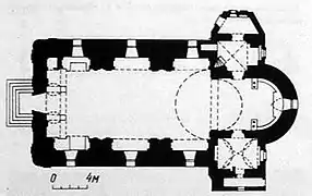 Звичайний тип більших церков X — XIII ст. — це тринавні церкви з трьома напівокруглими чи гранчастими апсидами (заокруглення з боку вівтаря), з двома або трьома парами стовпів. Між першою від вівтаря та другою парами стовпів через цілу церкву проходить поперечна неф. Середня найширша нава — такої самої ширини й висоти, як і поперечна нава (прохід); на перехресті їх угорі виводилася найбільша баня з верхньою точкою цілої церкви. Менші церкви були, можливо, однонавні з апсидою зі сходу. В Західній Україні виводилися також ротонди — округлі будови.