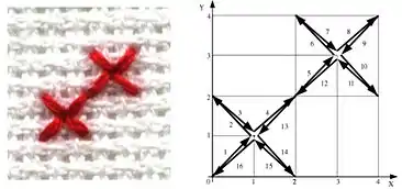 ![]() Схеми розташованих по діагоналі хрестів і їх фотографічне зображення, утворених подвійними хрестоподібними елементам (човникові стібки однакової довжини). |