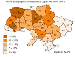 - Згідно з даними Всеукраїнського соціологічного опитування населення України, проведеного Фондом «Демократичні ініціативи» та фірмою «Юкрейніан соціолоджі сервіс» 22 листопада — 6 грудня 2011 року, найпопулярнішою релігійною конфесією в Україні є Українська Православна Церква Київського Патріархату