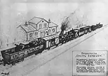 За допомогою місцевого населення Пирогівки, в досить короткий термін червоні обладнали імпровізований бронепотяг, назвавши його «Смерть буржуям». Ця назва була написана фарбою на стінах вагонів бронепоїзда. Коли «бронепоїзд» був готовий Ромченко з помічником Степановим в цілях розвідки вирушили на ньому в напрямку Шостки. У районі хутора Лазаревського до бронепоїзда з білим прапором підійшла група шосткинських повстанців та запропонувала вислати делегацію в їх штаб для переговорів. Як делегати пішли Ромченко зі Степановим. Переговори завершились тим, що повстанці пропустять загін на бронепоїзді через Шостку на Брянськ без бою та звільнять червоногвардійців, що потрапили у полон. Однак повстанці не втримали обіцянки, та обладнавши шанці та підірвавши маленький залізничний міст, прийняли рішення не пропускати червоних. Втім після того як бронепотяг відкрив вогонь, шосткинські повстанці не чинили опору, тому червоним вдалося полагодити міст та направитися через Шостку на ст. Терещенська, а потім на Хутір Михайлівський — Зернове до нейтральної зони[16].