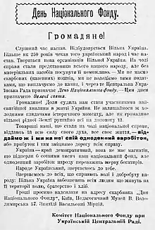 Після Всеукраїнського національного конгресу 1917 року УЦР утворила Комітет Українського національного фонду, губернські та повітові комітети на місцях. Комітет через періодичні видання звернувся до українців із закликом віддати свій одноденний заробіток на потреби національної справи[2].