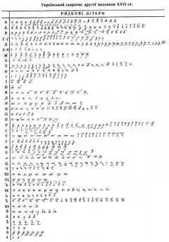 - Не всі літери відігравали однаково активну декоративну роль при письмі. Літери Л, П, Т, И, М, О, Ш, А, Н, Е писалися легко й відігравали роль пауз. Основне декоративне навантаження несли букви С, Б, К, З, Д, Е. Вони вихоплюються, як правило, вгору й униз від головної лінії рядка й своїми емоційними сплесками виносних елементів створюють своєрідну ритміку писання.[3]
