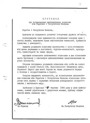 Україна визнала незалежність Республіки Молдова 21 грудня 1991 р. Дипломатичні відносини між Республікою Молдова та Україною були встановлені 10 березня 1992 р. Перший офіційний візит президента України Л.Кравчука до Молдови відбувся 23 жовтня 1992 р. Під час візиту був підписаний «Договір про добросусідство, дружбу та співробітництво між Україною і Республікою Молдова».