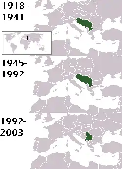 Югославія як держава виникла 1918 року після завершення Першої світової війни. Згодом її кордони і політичний устрій кількаразово змінювалися, аж поки 2003 року рештки Югославії було переформовано у Федерацію Сербії та Чорногорії, яка 2006 року розпалася на дві окремі держави (власне Чорногорію та Сербію).