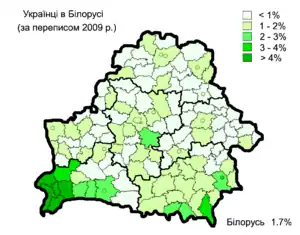 Українці Білорусі — відносно велика етнічна група українців, що мешкають у Білорусі. Перепис 1989 року нарахував 291 008 українців у Білорусі. Перепис 1999 — 237 014 українців. Згідно з останнім переписом населення, який відбувся у 2009 році, кількість українців становила 158,7 тис. осіб. Найбільша концентрація українців (40 тис., або 2,9 % населення) характерна для Берестейської області. Найбільша у країні частка українців зафіксована у Кам'янецькому (7,4 %), Малоритському (7,2 %), Берестейському (6,9 %), Кобринському (4,5 %), Жабинківському (4,3 %) районах та у місті Берестя (4,2 %).[1]